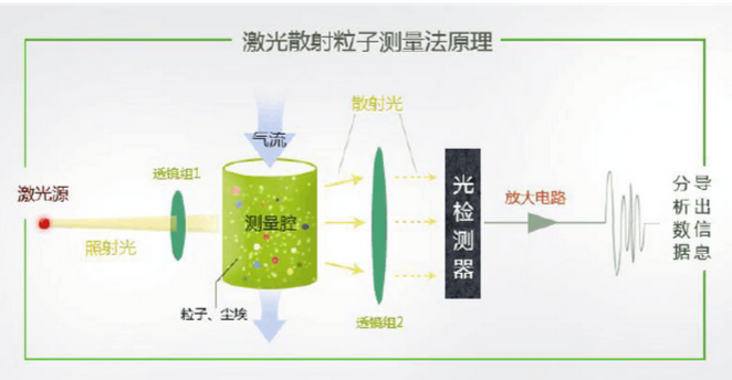 激光光散射粉塵儀通過采氣泵將待測氣溶膠吸入檢測艙,待測氣溶膠在分支處分流成為兩部分,一部分經(jīng)過一個高效過濾器后被過濾為干凈的空氣,作為保護鞘氣來保護傳感器室的元器件不受待測氣體污染。另一部分氣溶膠,作為待測樣品直接進入傳感器室。 傳感器室中,主要元器件為激光二極管、透鏡組和光電檢測器。檢測時,首先由激光二極管發(fā)出的激光,通過透鏡組形成一個薄層面光源。薄層光照射在流經(jīng)傳感器室的待測氣溶膠時,會產(chǎn)生散射,通過光電探測器來檢測光的散射光強。光電探測器受光照之后產(chǎn)生電信號,正比于氣溶膠的質(zhì)量濃度。然后乘以電壓校準系數(shù),這個系數(shù)通過測定特定濃度的氣溶膠來得到。